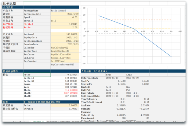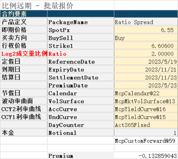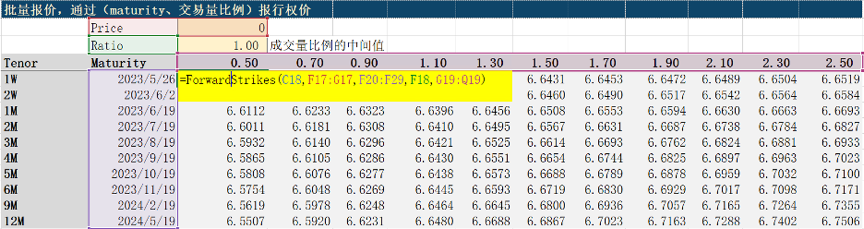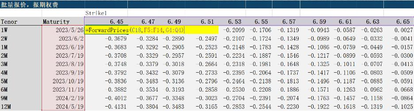 通過設(shè)定計算參數(shù),對不同到期日、行權(quán)價的期權(quán)進(jìn)行批量定價,以比例遠(yuǎn)期為例: